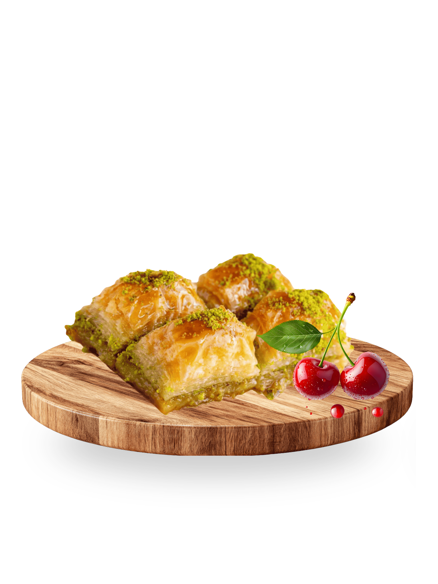 Kruche, złociste warstwy ciasta filo przełożone soczystą, lekko kwaskową wiśnią i delikatnie nasączone aromatycznym syropem. Idealne połączenie słodyczy i owocowej świeżości, które nadaje baklawie nowoczesny, wyrazisty charakter.